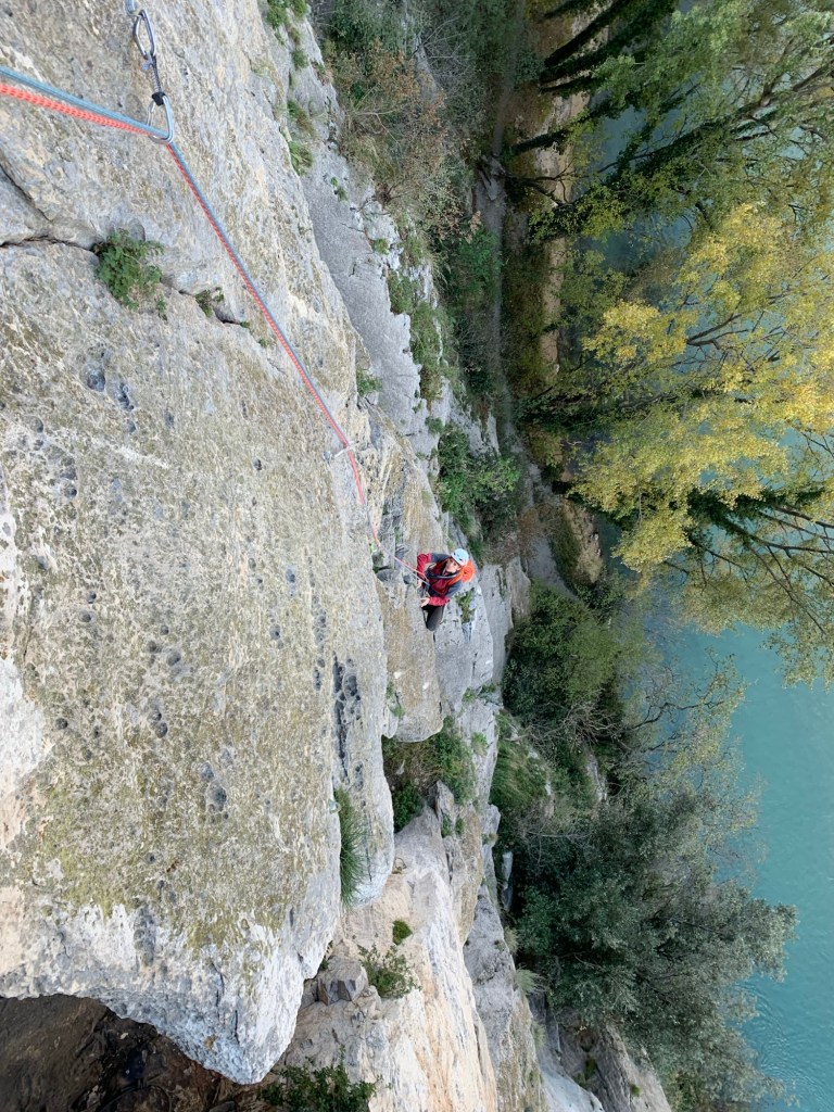 Ora ci troviamo davanti ad una bella placca grigia a destra del grande diedro, la si percorre prima su diritti po leggermente a destra a superare un strapiombino con passo un po’ lungo e superatolo si procede alla sosta. Sosta 4, 25 m., 10 fix, diff.6a.