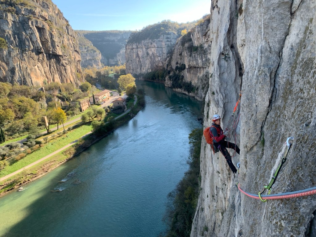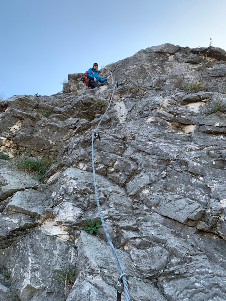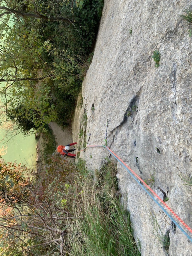 Discesa: dalla sommità si seguono verso destra degli ometti di sassi e dei bolli gialli sbiaditi, la traccia inizia dopo poco a scendere fino a che si trova un cavo d’acciaio che seguendolo su tratti anche verticali(meglio tenere ancora imbrago e casco addosso)ci porta alla piazzola dove abbiamo lasciato la macchina (fino a qui, 15 minuti).