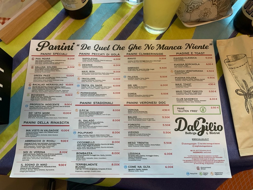 Note: prima di fare ritorno a casa consiglio vivamente una sosta alla osteria/trattoria/negozio “Dal Gilio” in centro a Rivoli Veronese. La varietà di cibo dai panini ai primi e secondi piatti della cucina veronese e delle bevande Birra e vino stuzzica non poco l’appetito. Sui menù troneggia il motto “De quel che ghè no manca niente”, frase ripetuta dal originario oste/bottegaio sig. Gilio.