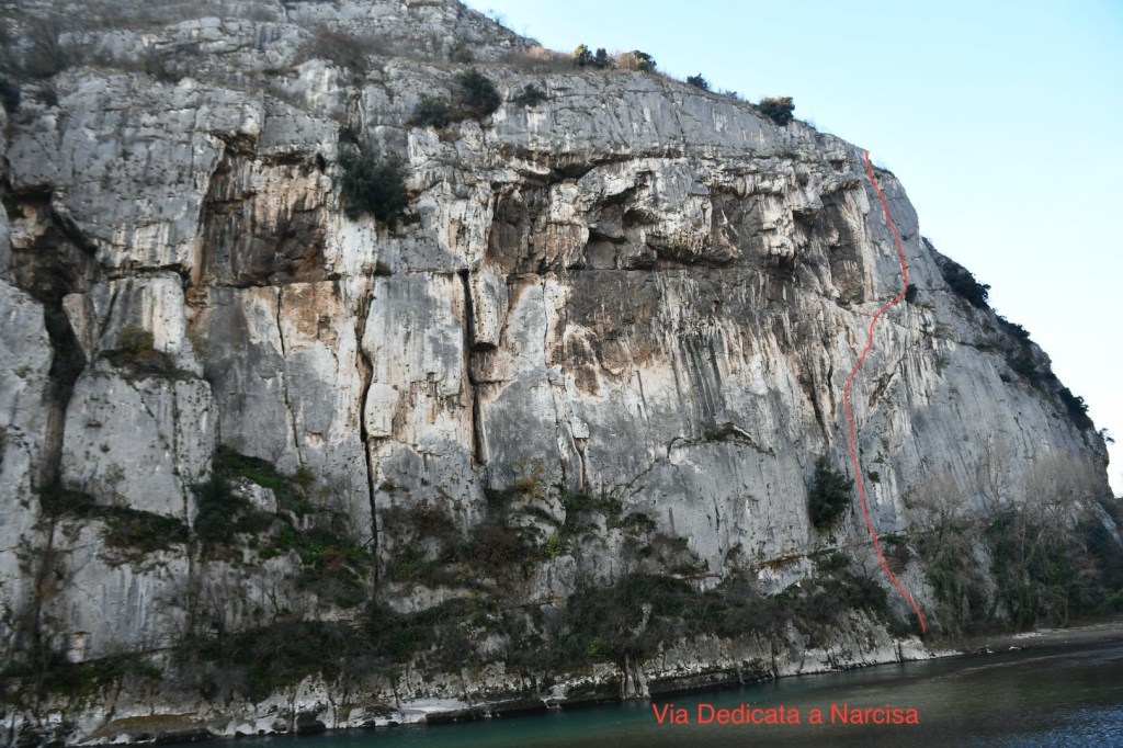 Oggi torno in Val d’Adige per affrontare una lunga trasferta verso la Chiusa di Ceraino, salendo sulla via “Dedicata a Narcisa”. Partiamo da casa non troppo presto, ma a causa di una deviazione a Rivalta, allunghiamo il percorso sulla SS12 fino a Volargne. Attraversiamo l’Adige per tornare a Rivoli Veronese e successivamente raggiungiamo la base della falesia. Le informazioni sulla via sono state reperite dal sito http://www.redclimber.it. La via è stata aperta da Giuseppe Zanini, Bruno Bettio e Michele Macrì tra il 1982 e il 1983; sebbene sia datata, è stata recentemente richiodata. È ben attrezzata con fix ravvicinati, la roccia è ottima e nonostante i suoi 40 anni, la via si presenta in ottime condizioni.