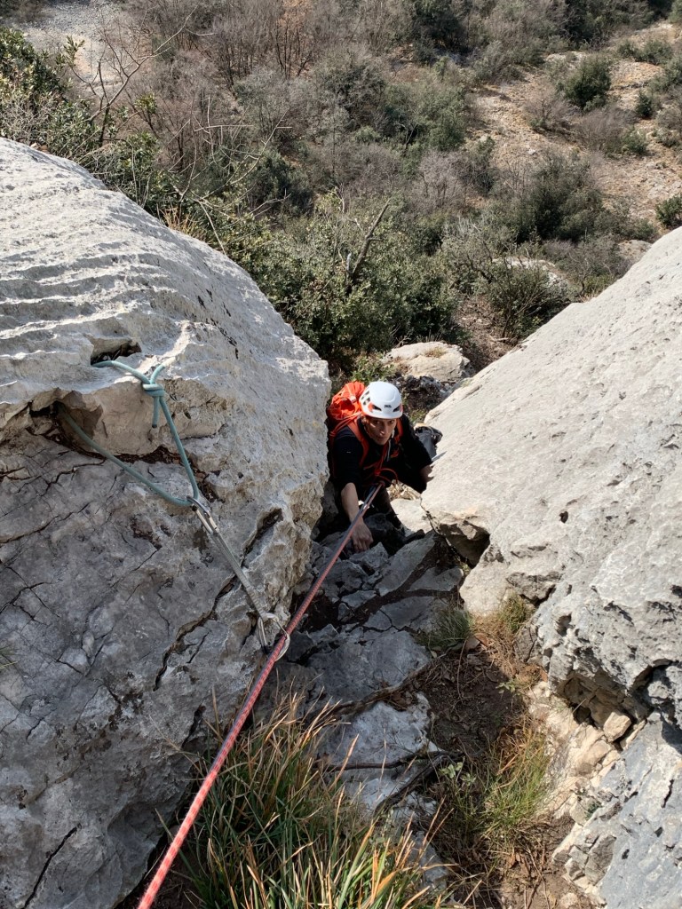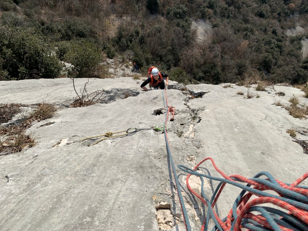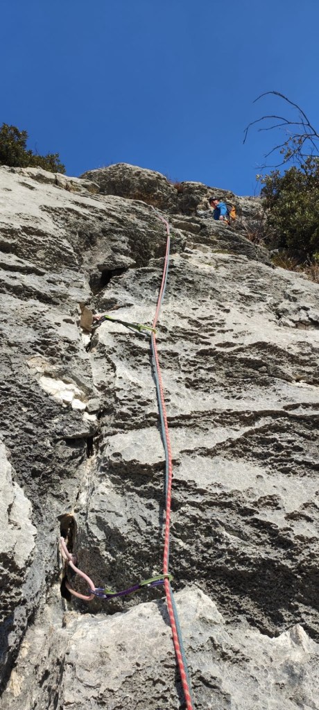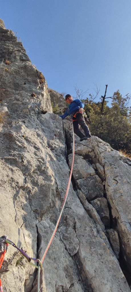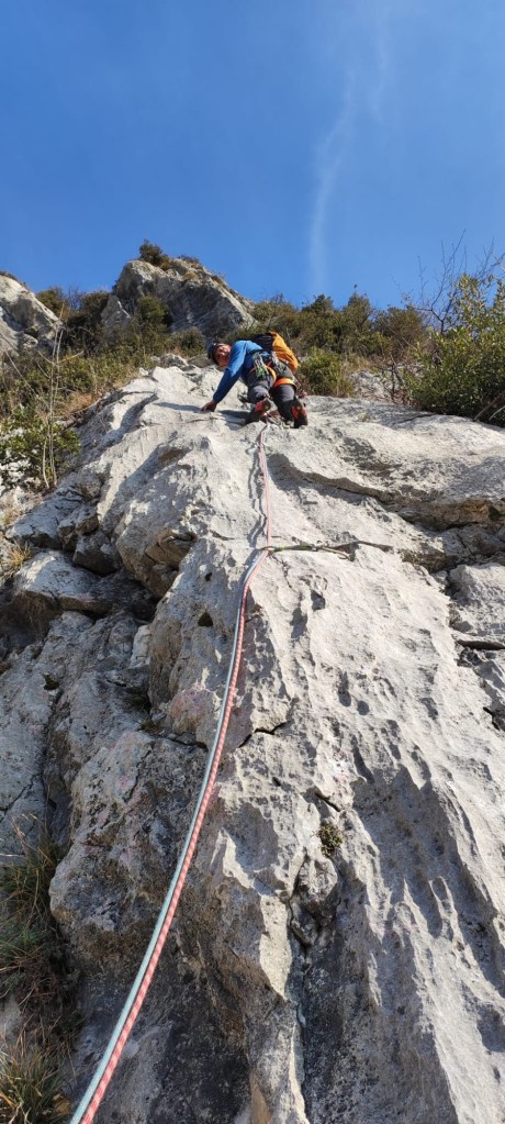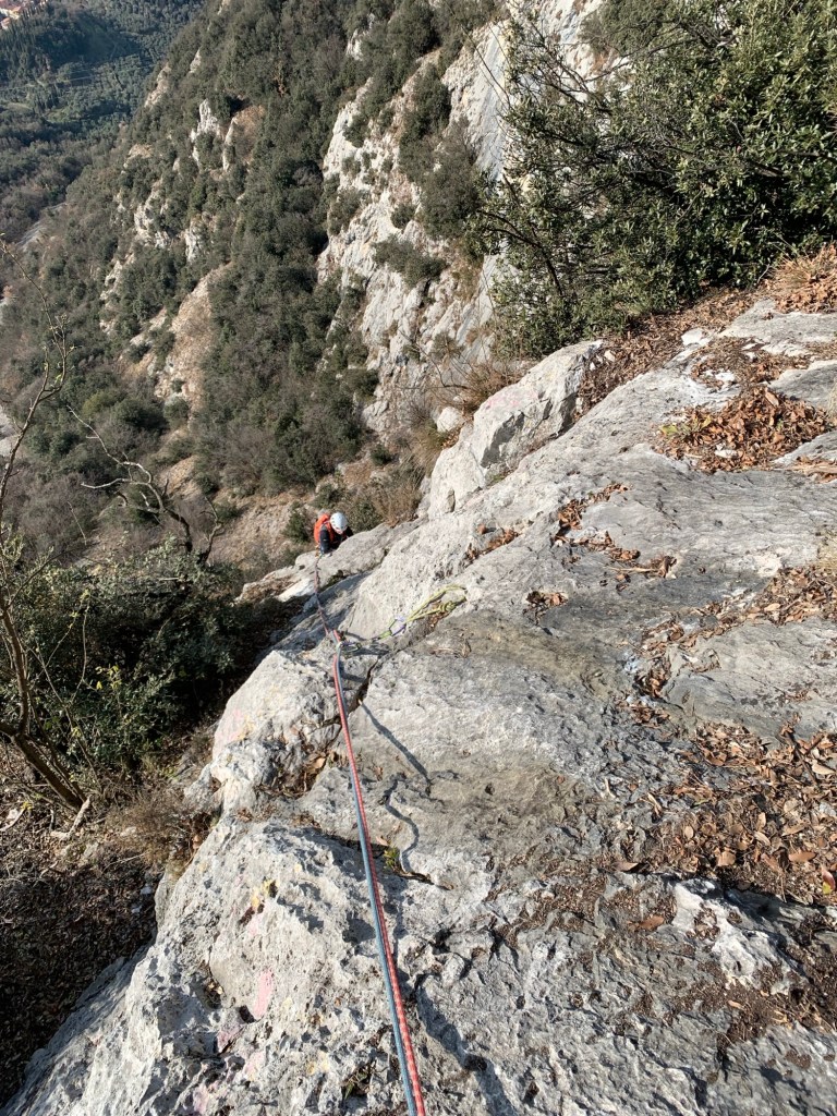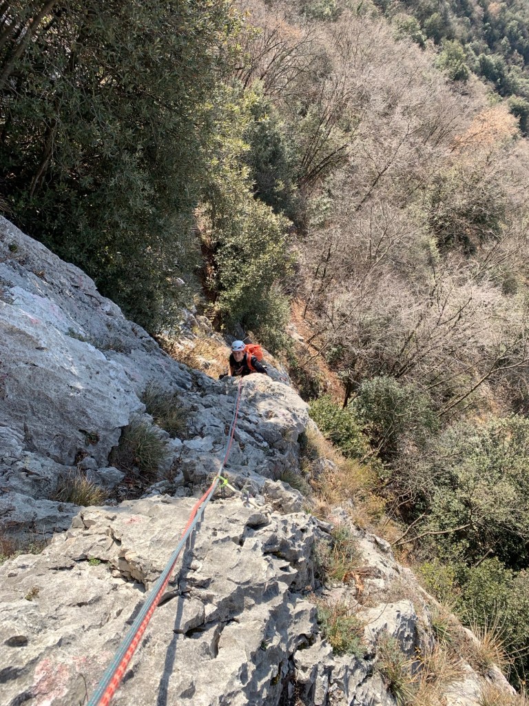 Ora si traversa facilmente a sinistra e si risale la parete (fix) facendo attenzione alla roccia si procede con facilità tenendo la destra fino ad arrivare su una traccia che permette di traversare a destra in un boschetto ma noi andiamo leggermente a sinistra fino a degli alberi dove si sosta e finisce la via. 7° tiro (40 m, 1 fix, 4 clessidre, difficoltà 4+)