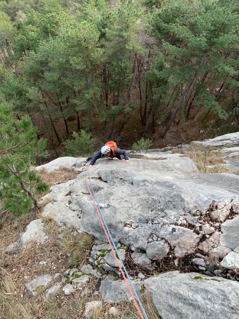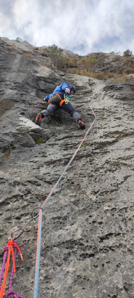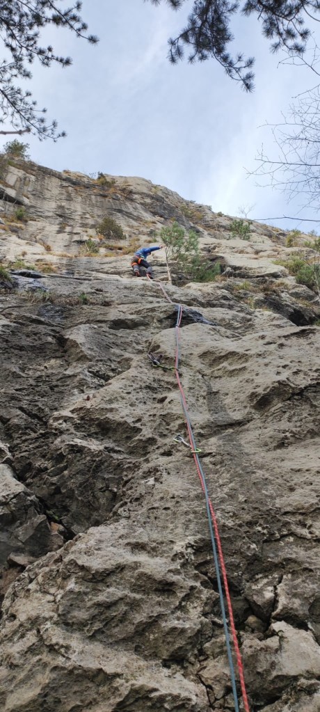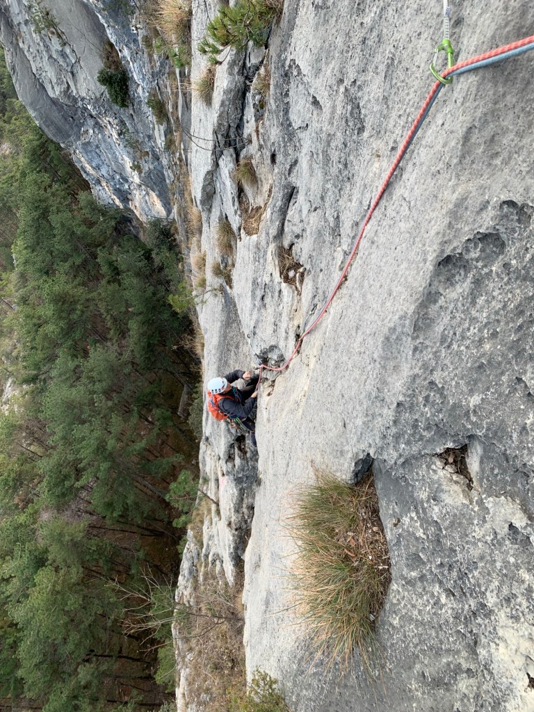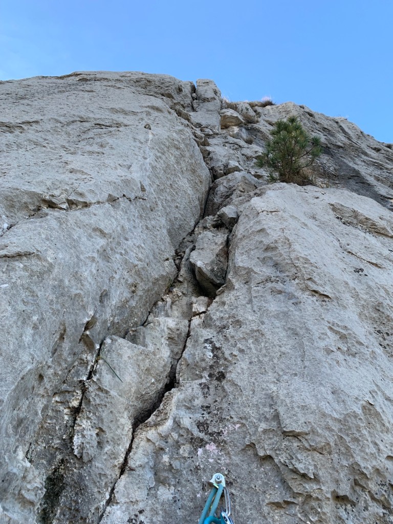 Il diedro/fessura finale è sopra la nostra testa. Subito sopra la sosta c’è uno stopper, ma per me mettere un rinvio mi sembra più faticoso che alzarmi un po’ e utilizzare il primo fix fuori a sinistra. Mi alzo, ma l’arrampicata mi sembra un po’ contorta, forse per via della conformazione di questo diedro. Più sopra i gesti si fanno più fluidi, ed esco dalla fessura con il sole sulla faccia. Ormai sono fuori, e pochi metri sopra vedo la sosta. Sosta 4, 25 m, 4 fix, 1 chiodo e uno stopper, difficoltà 6a.