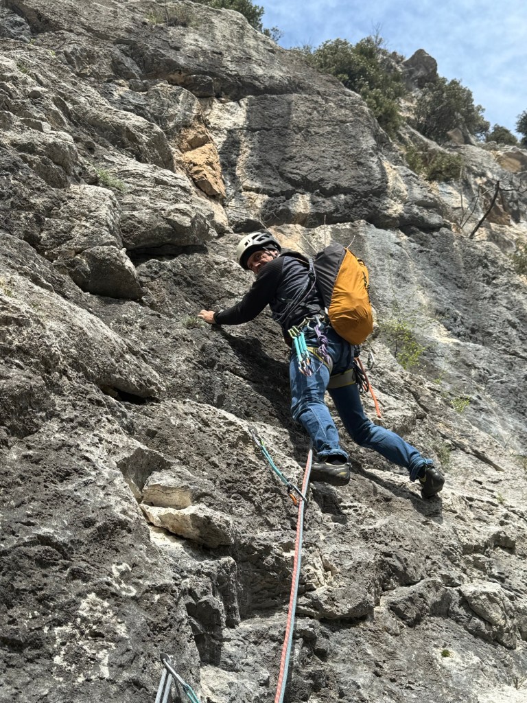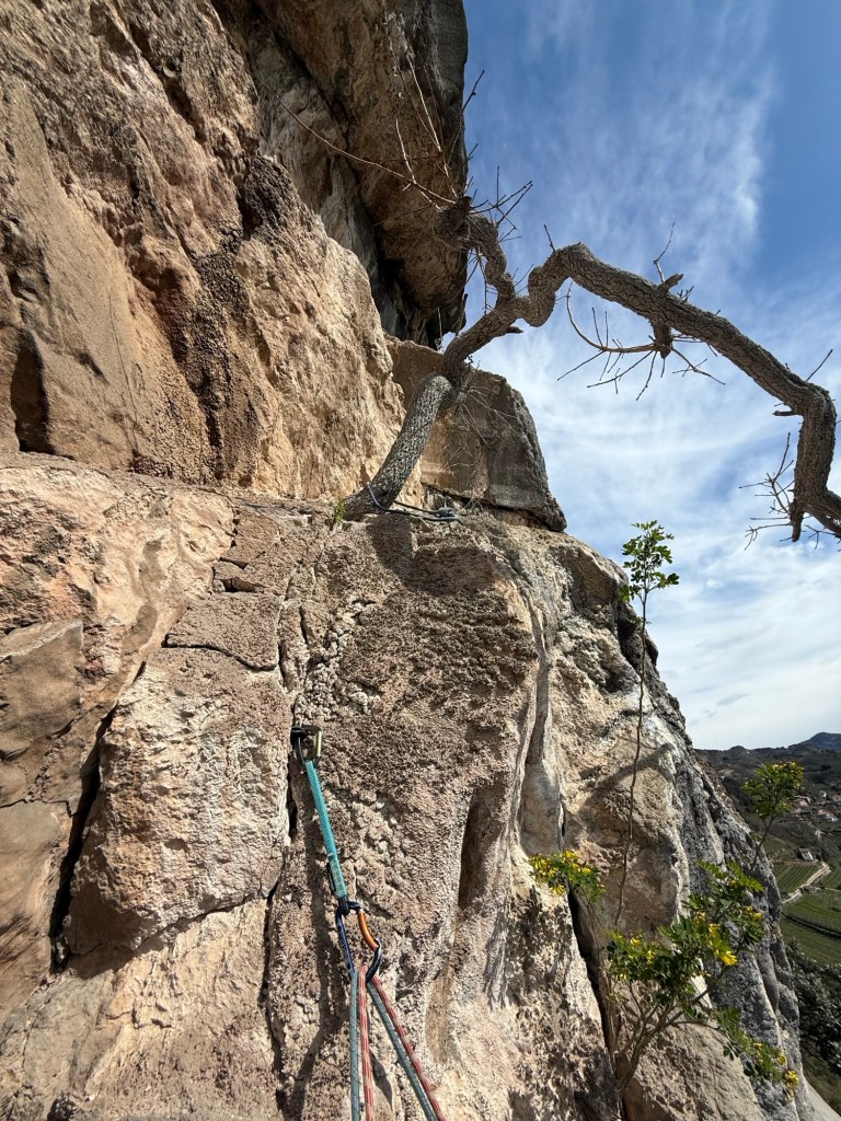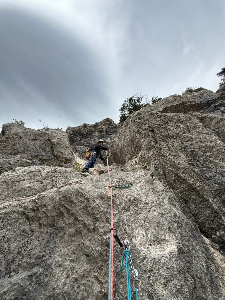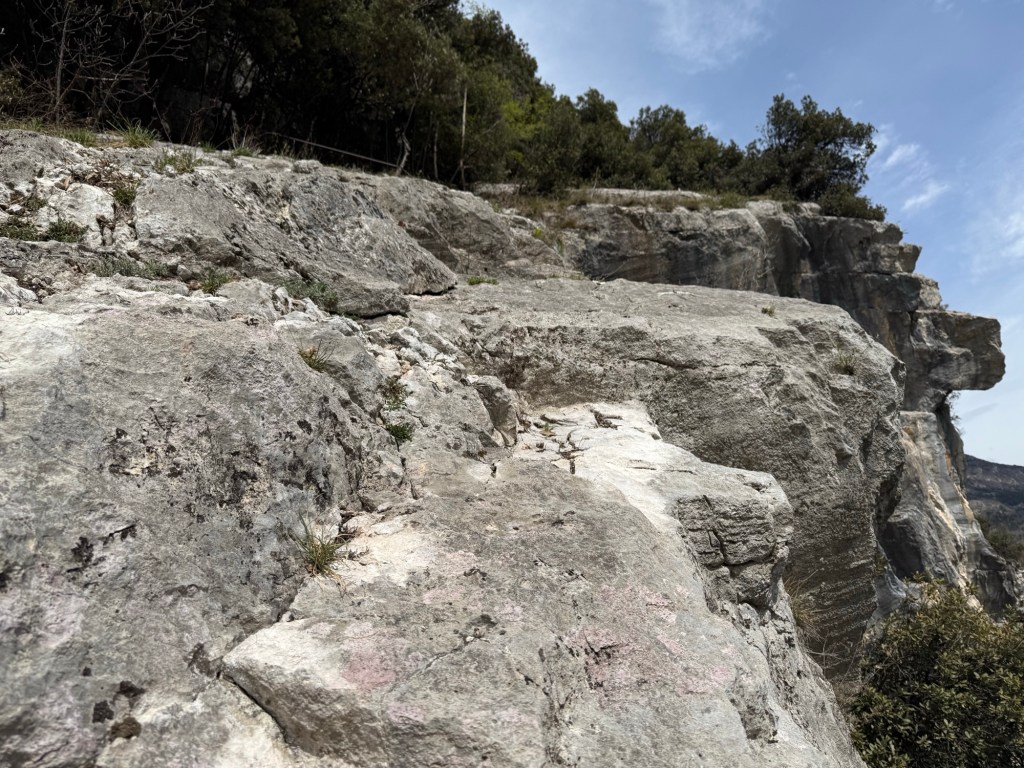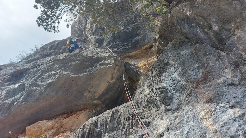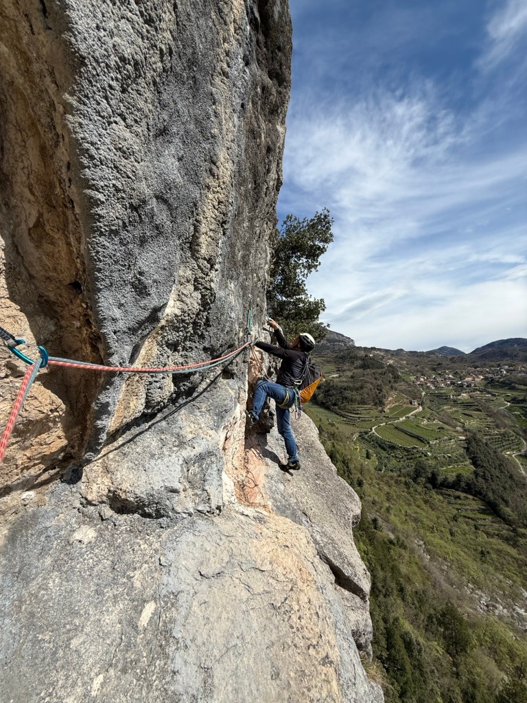 Si prosegue in verticale su roccia lavorata e, dopo pochi metri, si incontra una sosta su catena. Tuttavia, ho scelto di ignorarla per attraversare a sinistra, superando uno spigoletto e poi scendendo leggermente. Si continua quindi in leggera traversata fino a salire in verticale e raggiungere infine la sosta. La roccia è ottima lungo tutto il tiro, offrendo un arrampicata divertente.