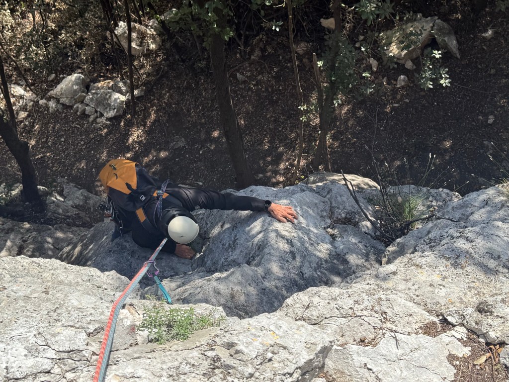 L’ultimo tiro risale facilmente il bordo della parete fino a incontrare una corda fissa che porta al bosco di uscita. Qui è possibile sostare su due fix.