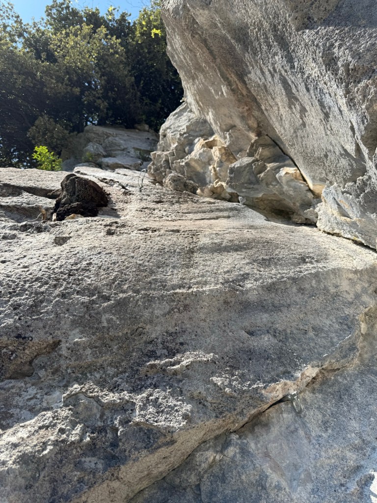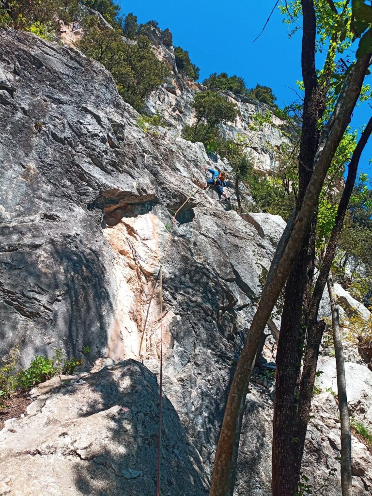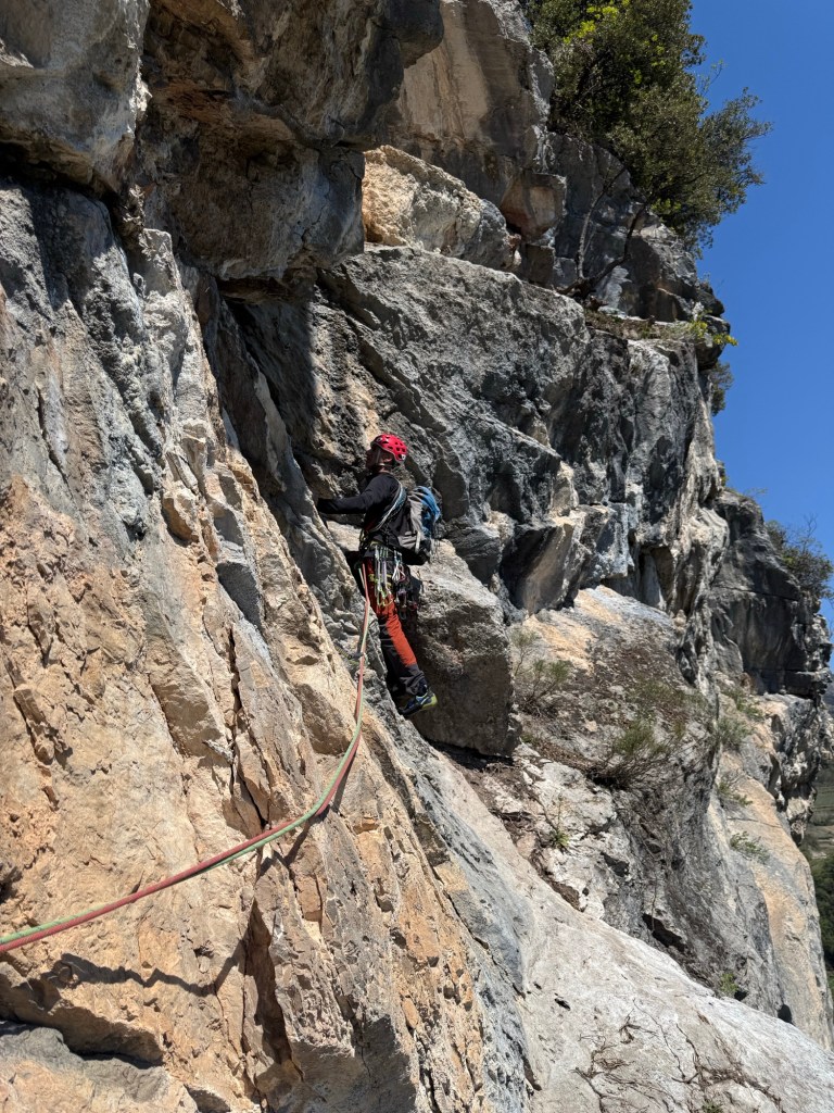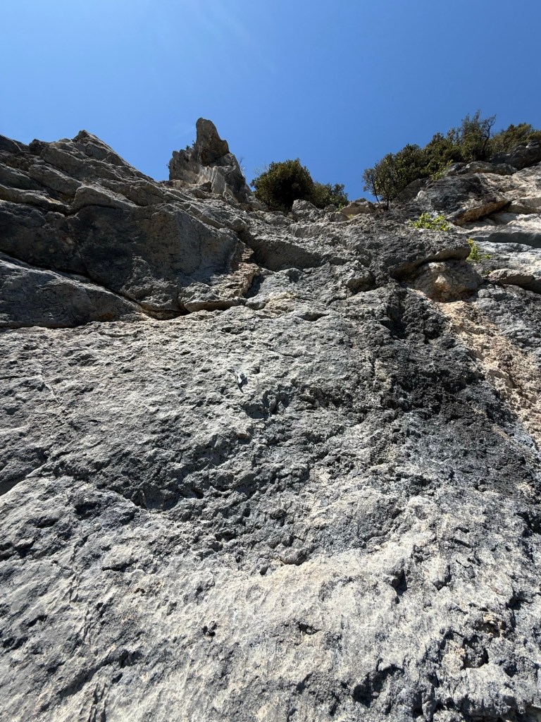 Il muro sopra la sosta è verticale e poco sopra il fix vi è una grande presa orizzontale che una ulteriore presina a sinistra ci aiuta a raggiungerla, più sopra ancora il mio compagno piazza una fettuccia nello spuntone affilato, il passo non è banale ma ben protetto, ora si traversa a destra verso lo spigolo, la roccia è eccellente e le difficoltà si riducono, si segue il filo dello spigolo e in breve alla sosta. Sosta 2 su 2 fix e catena, 15 m. 5 fix 1 ch., e 1 cl., diff. 6+(passo iniziale).