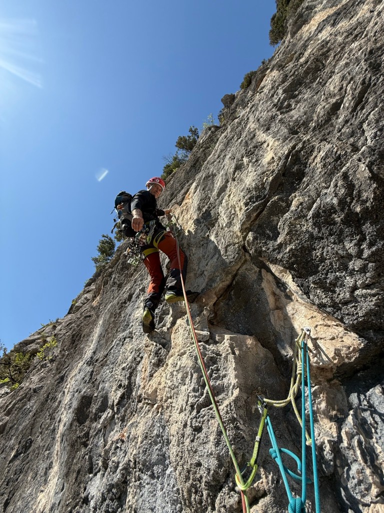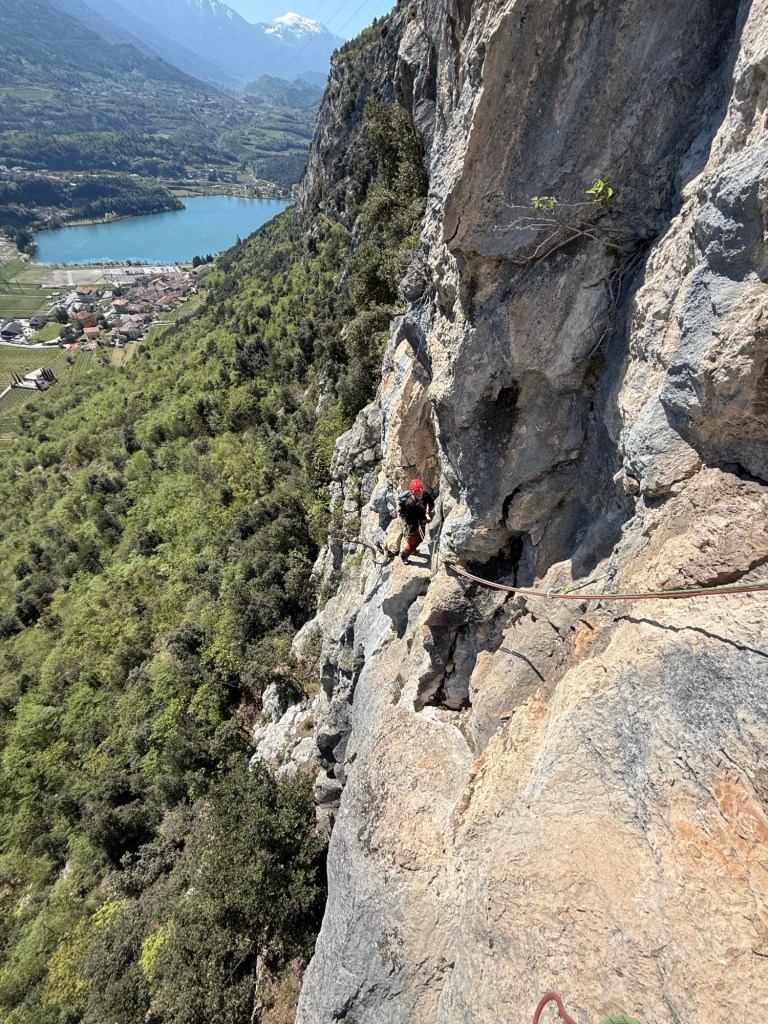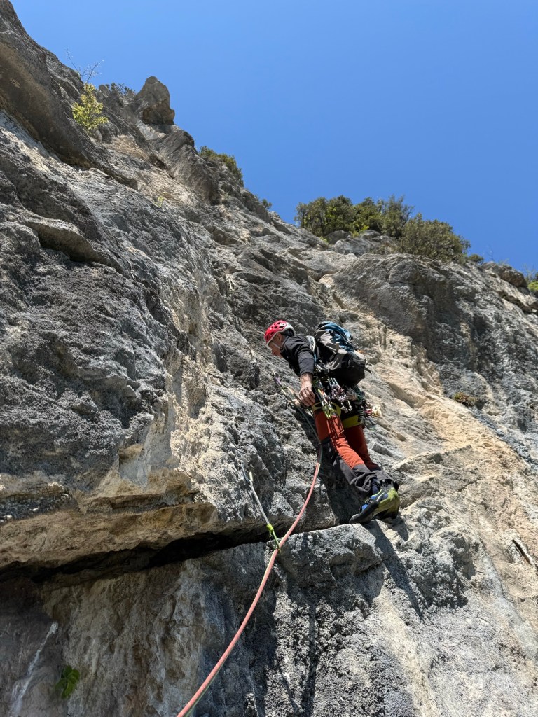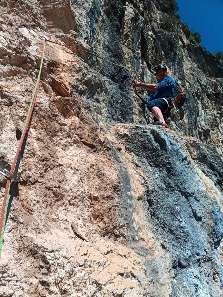 Oggi il mio compagno d’arrampicata è Beppe, è molto tempo che non scalo con lui ma l’intesa c’è sempre. Ci siamo accordati di non fare l’uscita diretta della via ma la variante. Il settore sinistro della Rupe di Santa Massenza ora è completato, questa via è l’ultima in ordine di tempo ,aperta nel 2024 da T.Zanetti , M.Dorigoni, Andrea Bressan e Federica Pincigher. È difficile dire quale è la più bella ma questa è sicuramente la più difficile e continua delle tre.