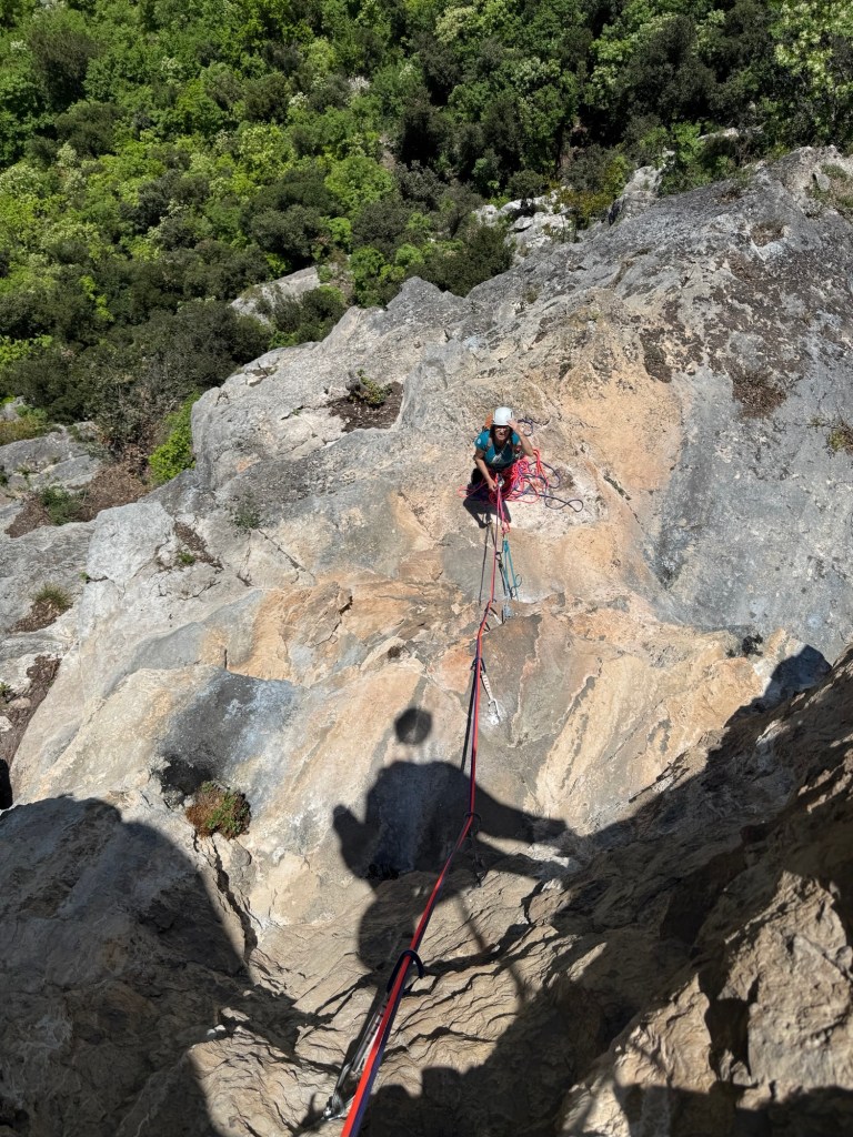 Seguendo poi la breve traccia che si inoltra nella vegetazione si incontra la traccia proveniente da sinistra uscita delle vie Alba Corallina e Nicole 23 che seguendola verso destra è la discesa.