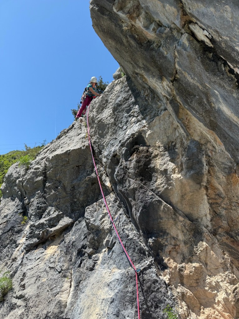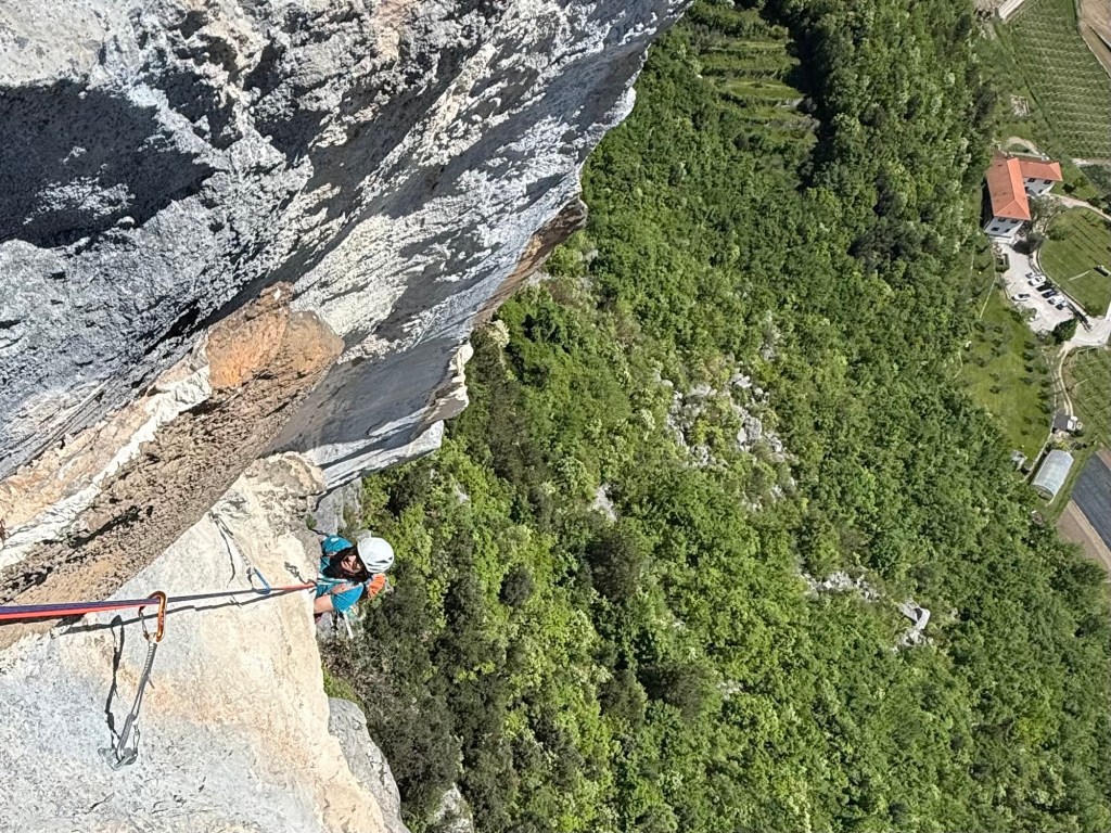 Oggi, con Kathrin, siamo andati a ripetere la via Nicole 23. Alla sosta prima dell’ultimo tiro, Kathrin ha accettato di uscire per la linea diretta della via “Frà Vecio”. Le lunghezze di questa uscita sono relativamente corte e, nella volta precedente, non avevo avuto l’opportunità di salirle.