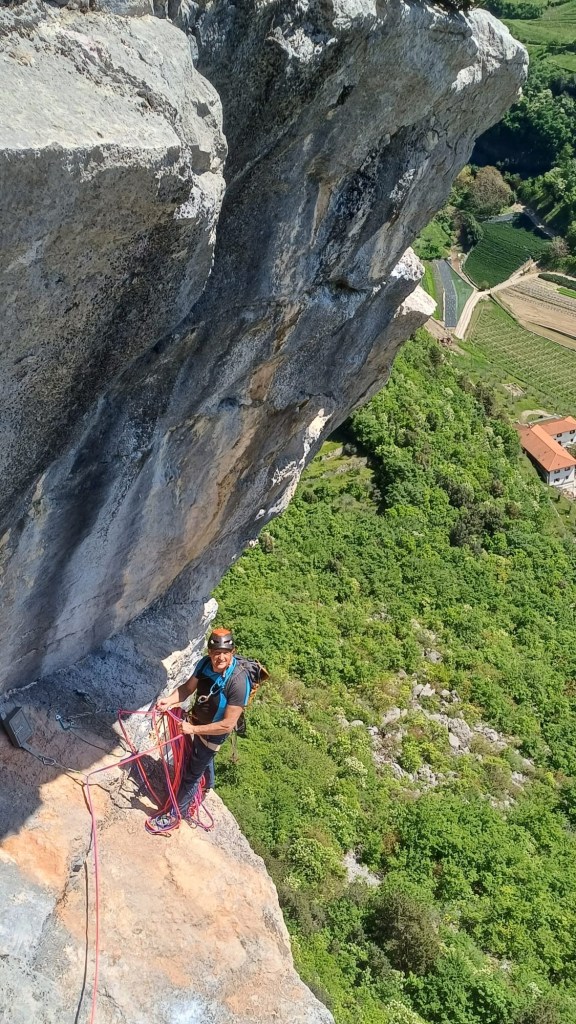 Dalla sosta della via Nicole 23, si traversa a destra su una facile placca per circa una decina di metri, fino a raggiungere la sosta da cui parte, sulla destra, la variante più facile della via. Il primo tiro dell’uscita diretta parte quindi dritto sopra la sosta. Subito sopra, un fix segna l’inizio; un gradone leggermente strapiombante offre prese abbastanza buone. A un certo punto, una presa verticale sottile è partita, ma poi, tenendomi un po’ a sinistra, sono riuscito a salire su un ballatoio che funge da base per un diedro strapiombante, povero di appigli. Dopo alcuni tentativi di alzarmi, ho desistito e mi sono tirato sui fix, che non sono molto vicini ma sufficientemente accessibili per progredire. Prima di uscire dallo strapiombo, un chiodino con anello aiuta a passare alla parete meno inclinata, che presenta più prese ruvide. Infine, una lama sulla destra conduce alla sosta, su due fix con catena. Sosta 6 della via Frà Vecio, 16 metri, 9 fix e 1 chiodo di difficoltà 8° (A0), è presente il libro di via.