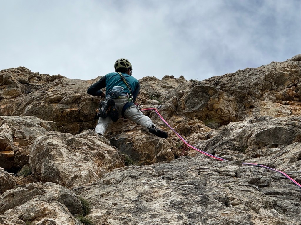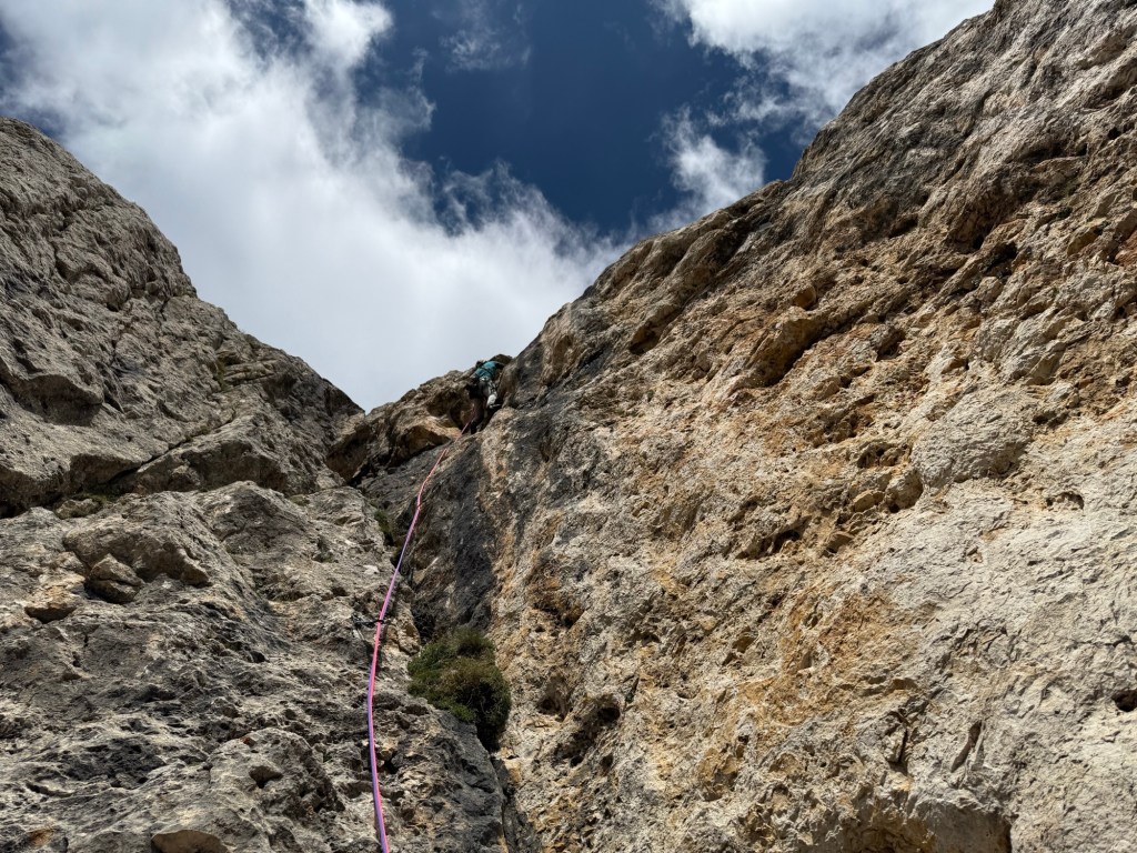 Bellissimo tiro su roccia eccellente e solida. Il diedro fessurato richiede attenzione nei movimenti, ma man mano che si sale si trovano buone prese. In alto, poco prima della sosta, si piega a destra: cercando nei buchi della roccia ci si alza nel diedrino finale fino alla sosta.