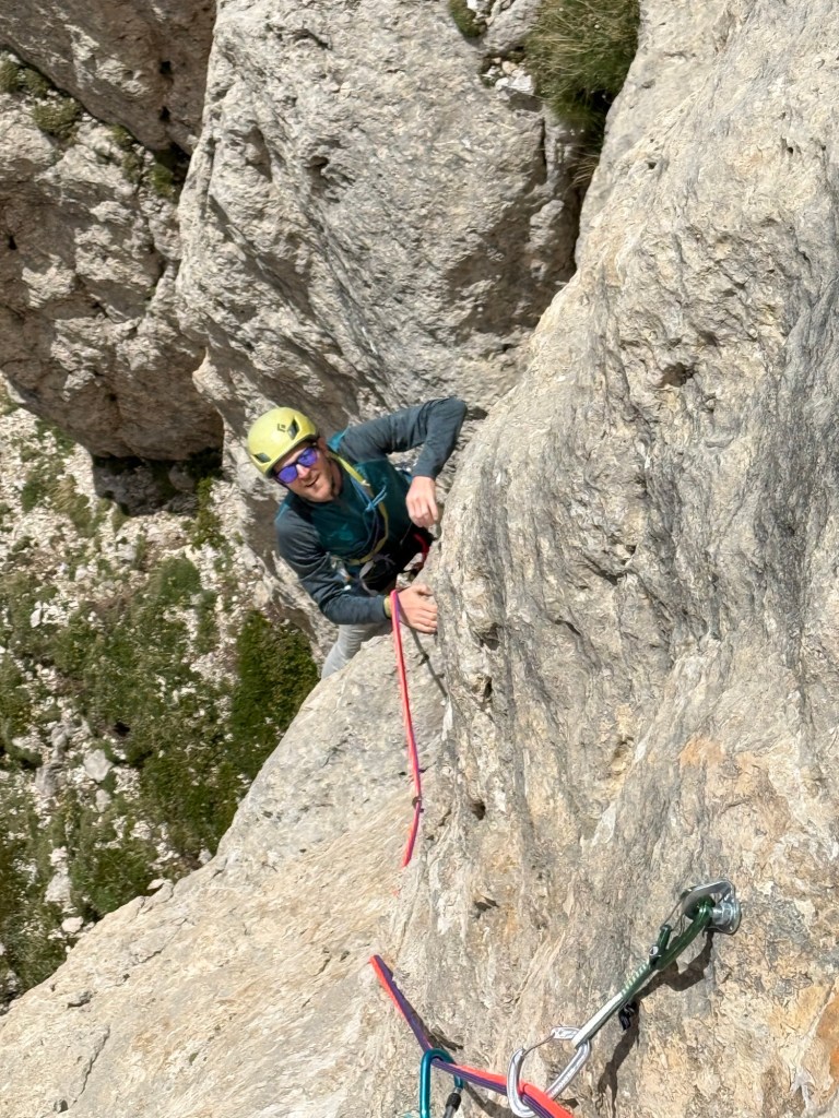 Si resta a sinistra della fessura che delimita la parete, poi ci si sposta a destra. Attenzione alla roccia: qualche blocco instabile. Si punta a uno strapiombo giallo/nero, dove un buco ideale come presa rovescia aiuta a superarlo. Dopo, la parete si adagia leggermente, poi torna verticale su bellissima roccia fino alla sosta su cresta.