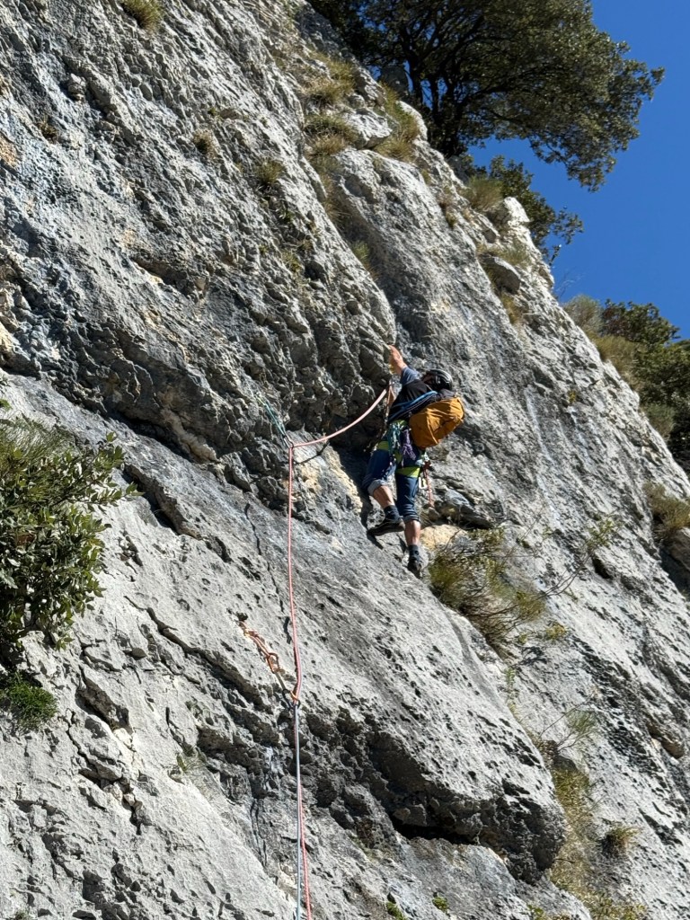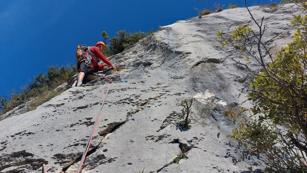 Dalla sosta ci si sposta a sinistra e si sale diritti per poi piegare a destra a prendere un diedro che si risale utilizzando le concrezioni della roccia e una bella lama in dülfer per salire poi prima della fine del diedro si risale uno strapiombo a sinistra che porta alla sosta dov è presente un ceppo d’albero alla base di una bella placca. Sosta 3 su fix e clessidra, 18 m. 3 fix e 4 cl.,diff.VI-.