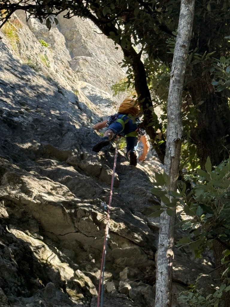 Il tiro successivo è una risalita di facili risalti che culminano sulla cengia alberata, sosta su due fix. Sosta 6, 25 m. 3 cl. , diff. II .