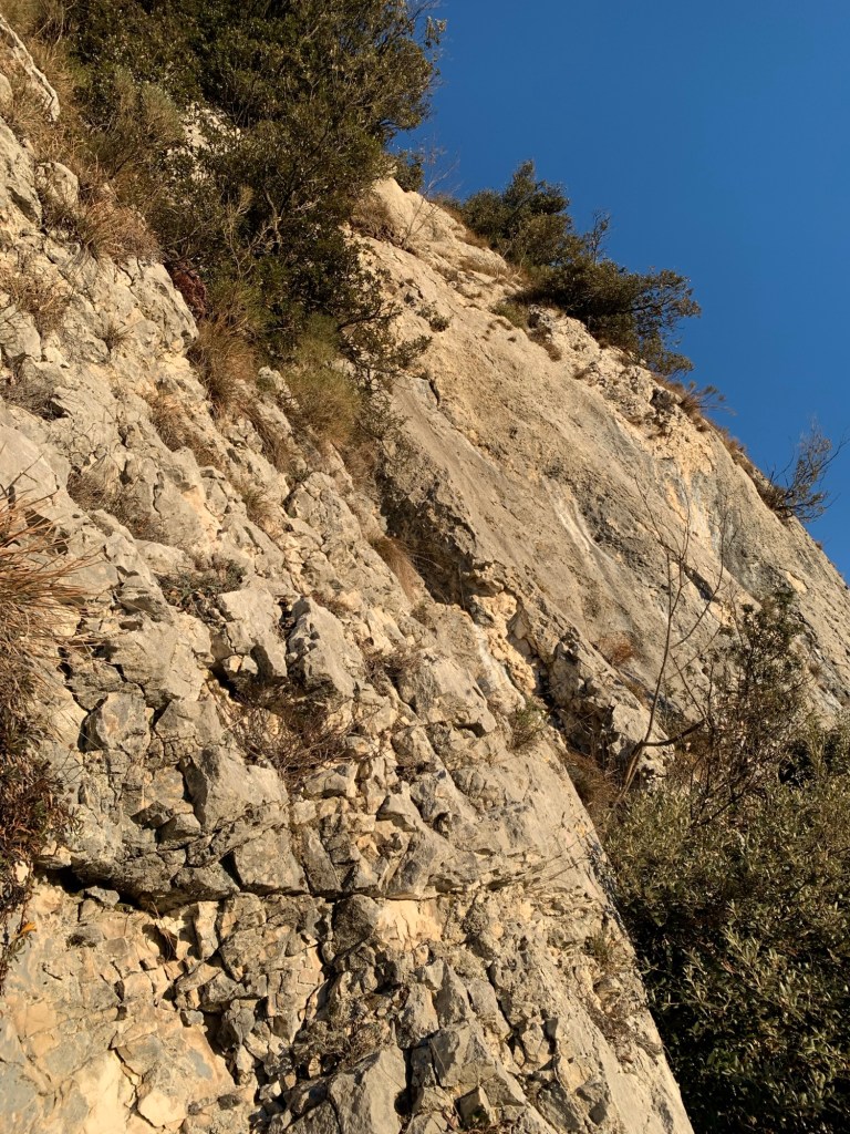 Il primo tiro parte dalla cengia e inizia in traversata verso sinistra. Si vedono cordini in clessidre, ma molti rami fuoriescono dalla fessura orizzontale. Per scavalcarli e proseguire, è necessaria una “tarzanata” fino a un cordone penzolante da un fix che indica la direzione della via. Ora si sale verso l’alto (a circa una decina di metri dalla partenza). La placca da superare è stata ripulita: appigli e appoggi sono visibili. Procedere non è difficile, ma impegna. La placca continua fino a incrociare il quinto tiro (traverso) della via “Le Pance del Pezol”. Giunti al tetto, si segue questa via per qualche metro verso destra fino alla sosta su clessidre. Il riferimento sono dei fix che salgono lo strapiombo sopra le clessidre.