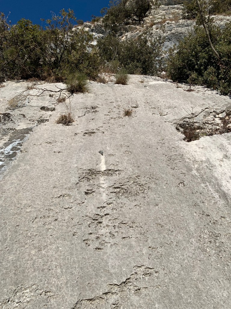 La placca sopra la sosta si supera andando prima a destra e poi a sinistra, cercando i buchi con vegetazione ben appigliati. Più sopra, si obliqua a sinistra sotto uno strapiombo e, dopo un muro verticale, si raggiunge la sosta a destra sotto un albero su fittone con anello.