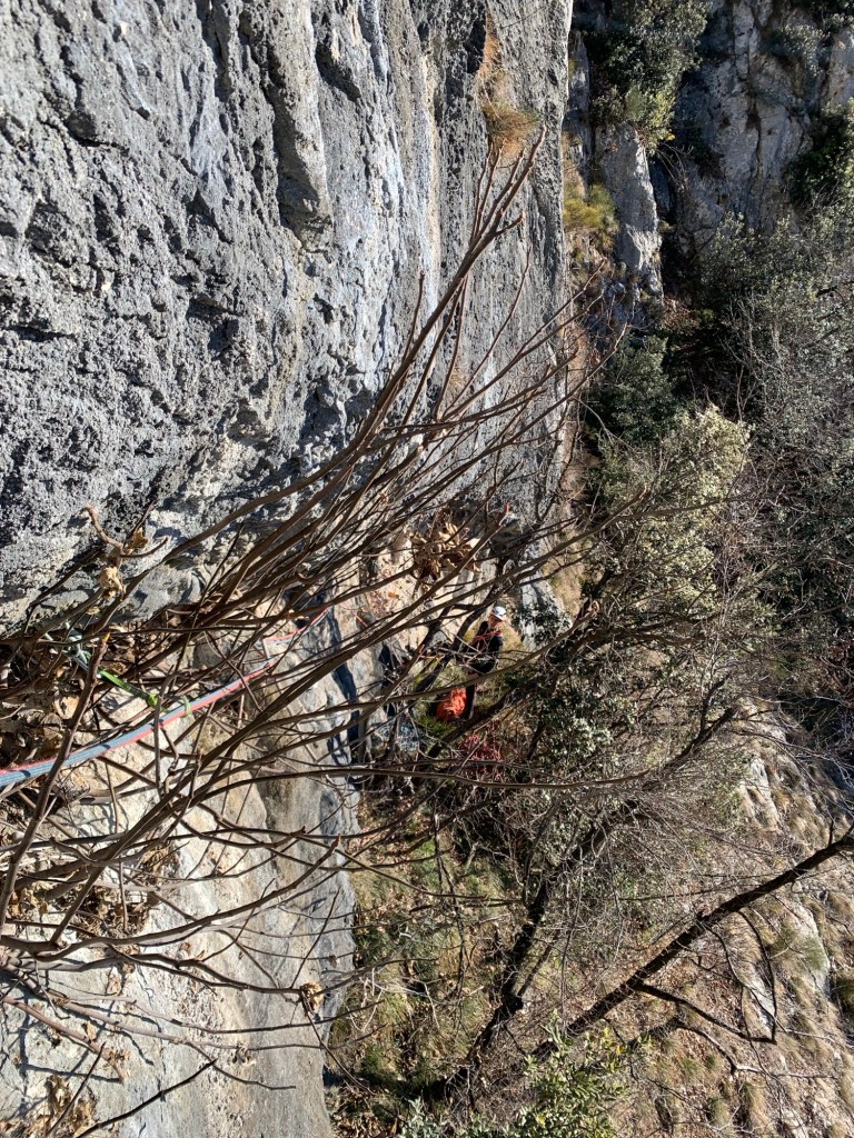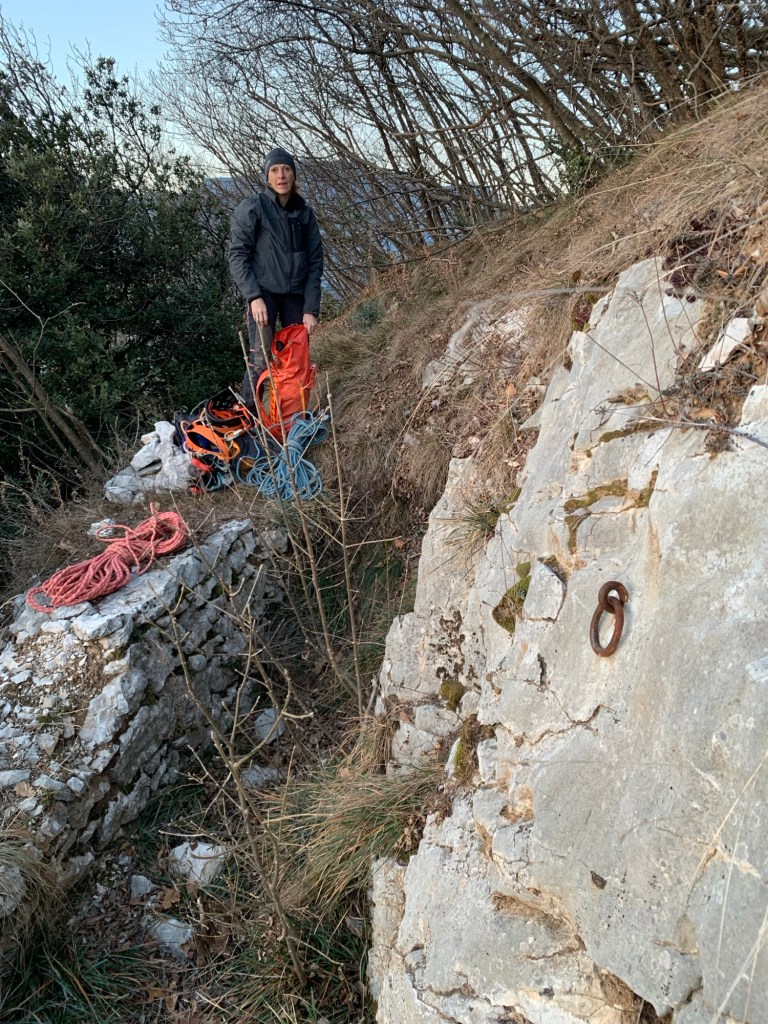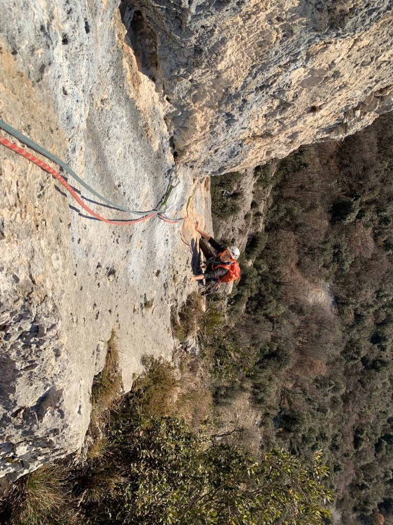 Per questa via avevamo poche indicazioni e ci siamo portati qualche friend medio (usato una volta il rosso). La via ha poche ripetizioni e, in particolare, i primi metri del primo tiro sono invasi dai rami che andrebbero tagliati. Per il resto, la via ci è piaciuta.