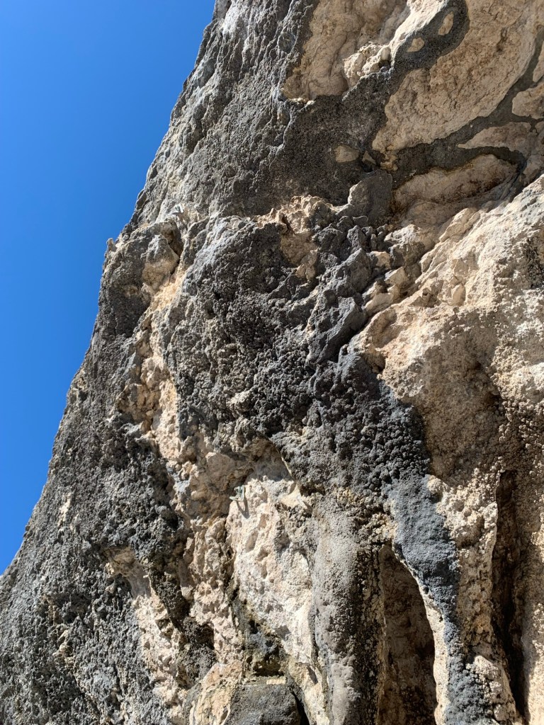 Dalla sosta si sale diritti per il diedro, e subito dopo la prima clessidra un passo ci impegna un po’. Si prosegue per il diedro fino ad aggirare lo spigolo a destra per poi stare sulla parete di sinistra, salendo su una costola per arrivare a destra alla sosta.