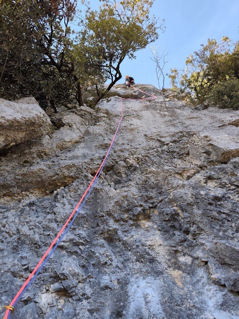 L1. Salire la placca articolata direttamente, quindi piegare a destra verso alcuni alberi. Tenersi poi a sinistra e raggiungere la sosta su due fix(30 m, 4 ch., 1 cl., diff. 4/4+).