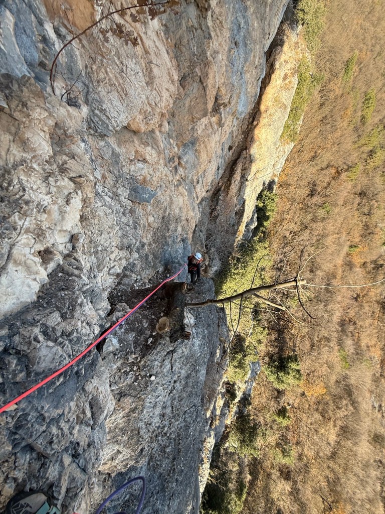 L4. Traversare a destra sotto lo strapiombo e risalire verticalmente (tiro chiave). Superato lo strapiombo, una presa a destra in un piccolo diedro facilita l’accesso a una cornice orizzontale; un ramo tagliato aiuta a issarsi sulla paretina che conduce alla sosta(15 m, 1 cl., 2 fix, 2 ch., diff. 7+ o A0).